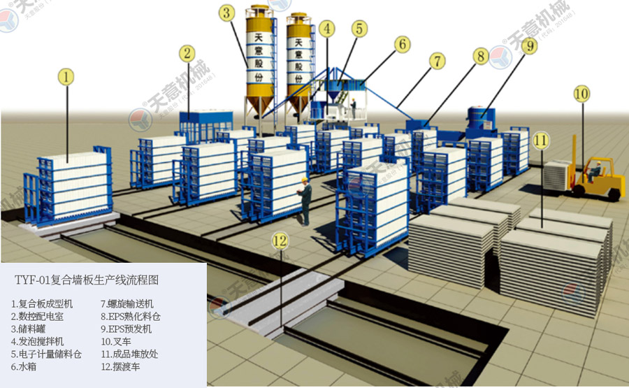 TY12型墻板生產(chǎn)線(xiàn)包括:墻板成型機(jī)、整體穿抽管系統(tǒng)、發(fā)泡系統(tǒng)、水箱、電子計(jì)量?jī)?chǔ)料倉(cāng)、螺旋上料輸送機(jī)、儲(chǔ)料罐、螺旋輸送機(jī)、EPS熟化料倉(cāng)、硫化干燥床、EPS預(yù)發(fā)機(jī)、數(shù)控配電室、發(fā)泡攪拌機(jī)、整體出板系統(tǒng)、叉車(chē)、成品堆放區(qū)、擺渡車(chē)。