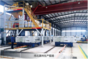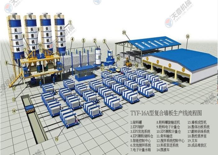 TYF-16A型復(fù)合墻板生產(chǎn)線是天意機(jī)械公司綜合國內(nèi)外技術(shù)經(jīng)驗,開發(fā)研制的新型墻體板材生產(chǎn)線。復(fù)合墻板生產(chǎn)線主要分為配料系統(tǒng)、攪拌系統(tǒng)、發(fā)泡系統(tǒng)、數(shù)控配電系統(tǒng)、墻板成型系統(tǒng)、料漿泵送系統(tǒng)、EPS預(yù)發(fā)系統(tǒng)、液壓循環(huán)系統(tǒng)、整體出板系統(tǒng)。