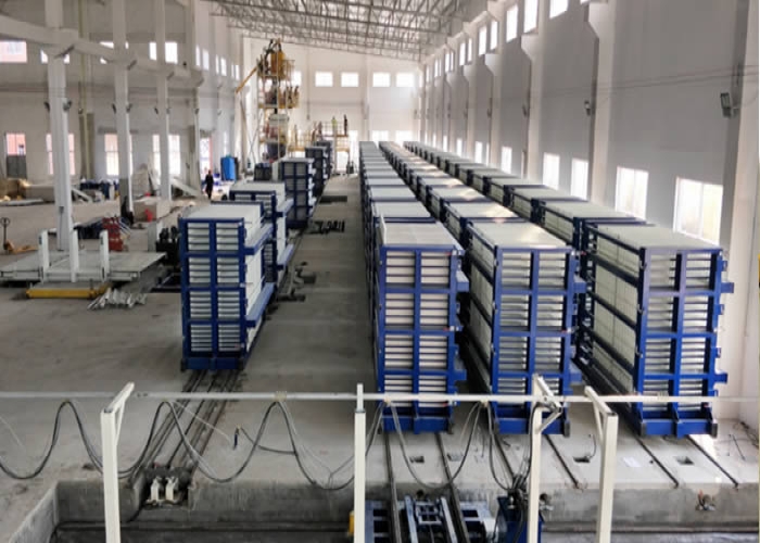 該復合墻板生產線立式旋轉臥式出板復合墻板成型機,一次可生產四十塊墻板,該生產線主要分為:配料攪拌系統(tǒng)、墻板成型系統(tǒng)、液壓整體開模系統(tǒng)、液壓翻轉系統(tǒng)、整體出板翻轉碼垛系統(tǒng)、成型機自動循環(huán)系統(tǒng)、變頻擺渡系統(tǒng)、數控配電系統(tǒng)等部件 組成。該生產線自動化程度高,液壓開合模,解決了傳統(tǒng)立式復合墻板機人工開合安全隱患,提高了工作效率。設備配有整體出板碼垛系統(tǒng),解決了傳統(tǒng)人工出板方式,減少產品的破損率,提高了產能。生產線使用密封式泵送系統(tǒng)配備雙工位注漿槍,注漿速度快密實度高,材料粘結更緊密。