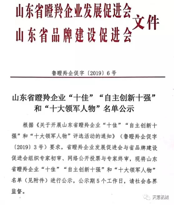 根據(jù)《關(guān)于開展山東省瞪羚企業(yè)十佳”“自主創(chuàng)新十強十大領(lǐng)軍人物評選活動的通知》(魯?shù)闪缙蟠僮帧?/span>20193號)要求,2019126日,山東省瞪羚企業(yè)發(fā)展促進會、山東省品牌建設(shè)促進會發(fā)布魯?shù)闪缙蟠僮?/span>[2019]6號文,公布經(jīng)過專家初審、網(wǎng)絡(luò)公開投票與專家終審,評選出了山東省瞪羚企業(yè)十佳自主創(chuàng)新十強十大領(lǐng)軍人物。天意機械榮獲“山東省十佳瞪羚企業(yè)”稱號。